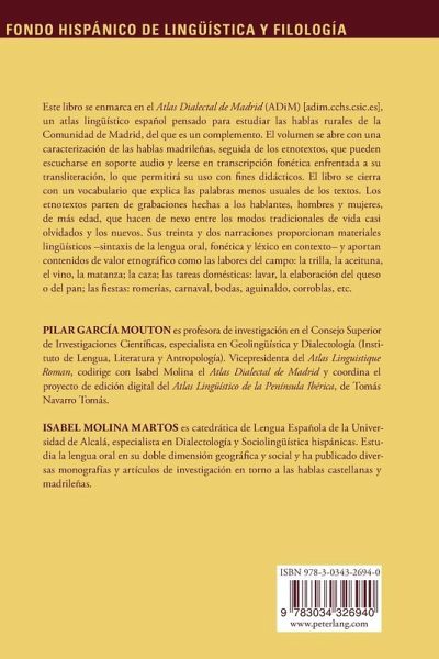 Este libro se enmarca en el Atlas Dialectal de Madrid (ADiM) [adim.cchs.csic.es], un atlas lingüístico español pensado para estudiar las hablas rurales de la Comunidad de Madrid, del que es un complemento. El volumen se abre con una caracterización de las hablas madrileñas, seguida de los etnotextos, que pueden escucharse en soporte audio y leerse en transcripción fonética enfrentada a su transliteración, lo que permitirá su uso con fines didácticos. El libro se cierra con un vocabulario que explica las palabras menos usuales de los textos. Los etnotextos parten de grabaciones hechas a los hablantes, hombres y mujeres, de más edad, que hacen de nexo entre los modos tradicionales de vida casi olvidados y los nuevos. Sus treinta y dos narraciones proporcionan materiales lingüísticos - sintaxis de la lengua oral, fonética y léxico en contexto - y aportan contenidos de valor etnográfico como las labores del campo: la trilla, la aceituna, el vino, la matanza; la caza; las tareas domésticas: lavar, la elaboración del queso o del pan; las fiestas: romerías, carnaval, bodas, aguinaldo, corroblas, etc.