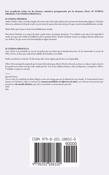 Esta recopilación incluye las dos historias románticas protagonizadas por las hermanas Alcott: SU ETERNA PROMESA Y SU ETERNA PRESENCIA. SU ETERNA PROMESA Arthur Yardley vuelve a Londres después de cuatro años. Necesitaba alejarse de una tentación demasiado peligrosa. Charlotte Alcott era, además de la hija de su jefe, una jovencita de apenas diecisiete años por la que se sentía irremediablemente atraído. Mejor dicho: por la que se siente irremediablemente atraído. Pero ahora Charlotte ya es mayor de edad y puede tomar sus propias decisiones. Y la realidad es que aún no ha superado la noche en la que todo estalló en la biblioteca de la mansión Alcott. ¿Puede Charlotte retomar su antigua obsesión adolescente por Arthur? ¿Es que acaso se ha interrumpido en algún momento SU ETERNA PRESENCIA Lizzy Alcott se ha instalado en casa de sus padres por un motivo que la familia desconoce. Se ha enamorado en secreto de Oliver Owen, el chico que cuida de los caballos de la familia en el establo. Nadie entendería esa relación. Ni ella misma sabe si tiene alguna opción de ser correspondida. Oliver Owen siempre ha suspirado por la mayor de las hermanas Alcott. Pero las chicas de su clase no se fijan en tipos como él. Esa puede ser la noche en la que todo cambie por fin. Uno de los caballos enferma y ella está dispuesta a acompañar a Oliver. Y también a tantear su corazón. ******* Querida lectora, Una vez más, he recopilado mi última bilogía en una sola entrega para que la disfrutéis de una sentada. Te recomiendo las breves historias de Charlotte y Lilly si te interesan los romances prohibidos con diferencia de edad y esas relaciones entre personas que pertenecen a dos mundos distintos y que solo se encuentran en circunstancias especiales. XXX Elsa