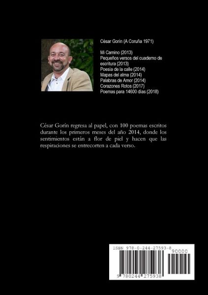 César Gorín regresa al papel, con 100 poemas escritos durante los primeros meses del año 2014, donde los sentimientos están a flor de piel y hacen que las respiraciones se entrecorten a cada verso.