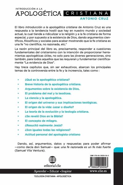 El libro Introducci¿¿n a la apolog¿¿tica cristiana de Antonio Cruz es una respuesta a la tendencia hostil que hay en nuestro mundo y sociedad actual, la cual tiende a ridiculizar a la religi¿¿n y a la fe cristiana de forma especial, y por supuesto a la existencia de Dios, dando argumentos cient¿¿ficos, filos¿¿ficos y sociales para acabar mostrando que la fe cristiana es una fe "no cient¿¿fica, no razonada, etc." La raz¿¿n principal del libro es, precisamente, responder a cuestiones fundamentales del cristianismo con la intenci¿¿n de proporcionar herramientas apolog¿¿ticas ¿¿tiles, no solo para los j¿¿venes, sino tambi¿¿n, para todos aquellos que las requieran y fundamentar cient¿¿ficamente "La evidencia de Dios". Hay trece cap¿¿tulos que, sin ser exhaustivos, abarcan los principales temas de la controversia entre la fe y la increencia. Temas como: la apolog¿¿tica, la cosmolog¿¿a, el dise¿¿o, la moral, el problema del mal, las relaciones entre la ciencia y la teolog¿¿a, el origen del universo y la vida, la teor¿¿a de la evoluci¿¿n, la Biblia como inspiraci¿¿n divina, el concepto de milagro, la resurrecci¿¿n de Jes¿¿s, la historicidad de Jes¿¿s, las principales cosmovisiones religiosas del mundo con el cristianismo, etc. Dando, as¿¿, argumentos y respuestas a preguntas tan actuales como: ¿¿En qü¿ hemos fracasado? ¿¿Qü¿ fundamentos teol¿¿gicos y racionales hemos inculcado a las j¿¿venes generaciones? ¿¿Por qü¿ abandonan sus creencias cristianas? ¿¿C¿¿mo es que no saben dar raz¿¿n de su fe? ¿¿Acaso se haya insistido demasiado en los sentimientos y poco en los argumentos o la reflexi¿¿n espiritual? ¿¿C¿¿mo podemos revertir esta realidad? Introduction to Christian Apologetics The book Introduction to Christian Apologetics of Antonio Cruz is a response to the hostile tendency of our current world and society, which tends to ridicule religion and Christian faith in a special way, and of course the existence of God. Giving scientific, philosophical, and social arguments to end up showing that the Christian faith is a faith "not scientific, not reasoned, etc. The main reason for the book is precisely to answer fundamental questions of Christianity with the intention of providing useful apologetic tools, not only for young people but also for all those who require them and to scientifically substantiate "The evidence of God." There are thirteen chapters that, without being exhaustive, cover the main themes of the controversy between faith and unbelief. Topics such as Apologetics, cosmology, design, morals, the problem of evil, the relations between science and theology, the origin of the universe and life, the theory of evolution the Bible as divine inspiration, the concept of miracle, the resurrection of Jesus, the story of Jesus, the main religious world views with Christianity, etc. Thus, giving arguments and answers to current questions such as: In what have we failed? What theological and rational foundations have we instilled in young generations? Why do they abandon their Christian beliefs? How do they not know how to give a reason for their faith? Have you insisted too much on feelings and little on arguments or spiritual reflection? How can we reverse this reality?