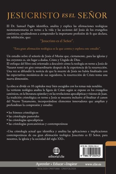 El libro Jesucristo es el Se¿¿or, Cristolog¿¿a del Nuevo Testamento, de Samuel Pag¿¿n intenta identificar, analizar y explicar las afirmaciones teol¿¿gicas neotestamentarias en torno a la vida y las acciones del Jes¿¿s de los evangelios can¿¿nicos, que nos permiten comprende la importante profesi¿¿n de fe que declara sin inhibici¿¿n que "Jesucristo es el Se¿¿or". El enfoque y esfuerzo fundamental del libro est¿¿ orientado a descubrir c¿¿mo la teolog¿¿a en torno a Jes¿¿s de Nazaret tom¿¿ un giro extraordinario luego de la experiencia de la resurrecci¿¿n. Una vez se difundi¿¿ la noticia de que la muerte de Jes¿¿s no hab¿¿a finalizado con las expectativas mesi¿¿nicas de sus seguidores, la resurrecci¿¿n de Cristo toma dimensi¿¿n nueva. Este libro explora la cristolog¿¿a del Nuevo Testamento. Y esa vertiente teol¿¿gica analiza la figura de Cristo, seg¿¿n se revela en los evangelios can¿¿nicos, la literatura epistolar y en las revelaciones apocal¿¿pticas y visiones de Juan. Esa tradici¿¿n cristol¿¿gica en torno a Jes¿¿s se revela inclusive al finalizar el canon del Nuevo Testamento. El vidente Juan, al comenzar la redacci¿¿n de la revelaci¿¿n divina, afirma de manera categ¿¿rica la importancia de la revelaci¿¿n de Jesucristo. Nuestro estudio en torno a Jesucristo el Se¿¿or explorar¿¿ el desarrollo de la teolog¿¿a referente al Cristo de Dios, desde la resurrecci¿¿n hasta las revelaciones de Juan en el Apocalipsis. Adem¿¿s, estudiaremos los t¿¿tulos cristol¿¿gicos, los himnos de las iglesias primitivas y varias reflexiones pastorales que se incorporan en las cartas del ap¿¿stol Pablo y sus seguidores. La finalidad es identificar y analizar el contenido teol¿¿gico de esa gran declaraci¿¿n de fe para explorar sus implicaciones contempor¿¿neas. Jesus Christ is Lord: Christology of the New Testament The book Jesus Christ is Lord, Christology of the New Testament, by Samuel Pag¿¿n attempts to identify, analyze and explain the New Testament theological affirmations about the life and actions of the Jesus of the canonical Gospels, which allow us to understand the important profession of faith that declares without inhibition that "Jesus Christ is Lord". The fundamental focus and effort of the book is oriented to discover how the theology surrounding Jesus of Nazareth took an extraordinary turn after the experience of the resurrection. Once the news spread that Jesus' death had not ended the messianic expectations of his followers, the resurrection of Christ took on a new dimension. This book explores the Christology of the New Testament. And that theological strand analyzes the figure of Christ, as revealed in the canonical Gospels, the epistolary literature, and in the apocalyptic revelations and visions of John. That Christological tradition around Jesus is revealed even at the end of the New Testament canon. The seer John, at the beginning of the writing of the divine revelation, categorically affirms the importance of the revelation of Jesus Christ. Our study of Jesus Christ the Lord will explore the development of the theology concerning the Christ of God from the resurrection to John's revelations in Revelation. In addition, we will study the Christological titles, the hymns of the early churches and various pastoral reflections that are incorporated in the letters of the apostle Paul and his followers. The aim is to identify and analyze the theological content of this great statement of faith in order to explore its contemporary implications.