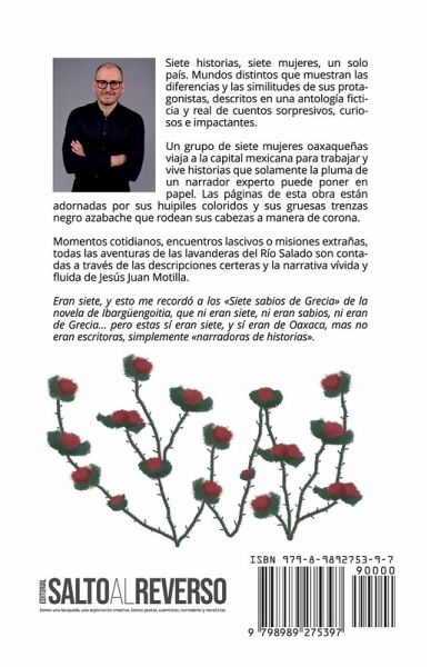 Siete historias, siete mujeres, un solo país. Mundos distintos que muestran las diferencias y las similitudes de sus protagonistas, descritos en una antología ficticia y real de cuentos sorpresivos, curiosos e impactantes. Un grupo de siete mujeres oaxaqueñas viaja a la capital mexicana para trabajar y vive historias que solamente la pluma de un narrador experto puede poner en papel. Las páginas de esta obra están adornadas por sus huipiles coloridos y sus gruesas trenzas negro azabache que rodean sus cabezas a manera de corona. Momentos cotidianos, encuentros lascivos o misiones extrañas, todas las aventuras de las lavanderas del Río Salado son contadas a través de las descripciones certeras y la narrativa vívida y fluida de Jesús Juan Motilla. Eran siete, y esto me recordó a los Siete sabios de Grecia de la novela de Ibargüengoitia, que ni eran siete, ni eran sabios, ni eran de Grecia... pero estas sí eran siete, y sí eran de Oaxaca, mas no eran escritoras, simplemente narradoras de historias.