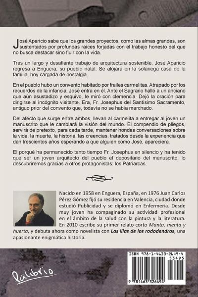 José Aparicio sabe que los grandes proyectos, como las almas grandes, son sustentados por profundas raíces forjadas con el trabajo honesto del que no busca destacar sino fluir con la vida. Tras un largo y desafiante trabajo de arquitectura sostenible, José Aparicio regresa a Enguera, su pueblo natal. Se alojará en la solariega casa de la familia, hoy cargada de nostalgia. En el pueblo hubo un convento habitado por frailes carmelitas. Atrapado por los recuerdos de la infancia, José entra en él. Ante el Sagrario halló a un anciano que aún asustadizo y esquivo, le miró con clemencia. Dejó la oración para dirigirse al incógnito visitante. Era, Fr. Josephus del Santísimo Sacramento, antiguo prior del convento que, todavía no se había marchado. Del afecto que surge entre ambos, llevan al carmelita a entregar al joven un manuscrito que le cambiará la visión del mundo. El compendio de pliegos, servirá de pretexto, para cada tarde, mantener hondas conversaciones sobre la vida, la muerte, la historia, las creencias, tratados desde la experiencia que dan trescientos años esperando a que alguien como José, apareciera. El porqué ha permanecido tanto tiempo Fr. Josephus en silencio y ha tenido que ser un joven arquitecto del pueblo el depositario del manuscrito, lo descubriremos gracias a otros protagonistas: los Patriarcas