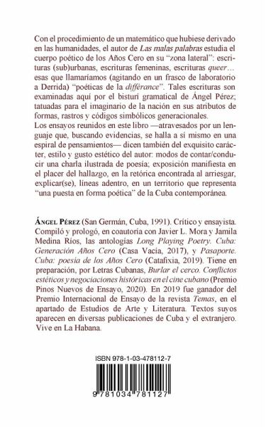 Con el procedimiento de un matemático que hubiese derivado en las humanidades, el autor de Las malas palabras estudia el cuerpo poético de los Años Cero en su "zona lateral": escrituras (sub)urbanas, escrituras femeninas, escrituras queer... esas que llamaríamos (agitando en un frasco de laboratorio a Derrida) "poéticas de la différance". Tales escrituras son examinadas aquí por el bisturí gramatical de Ángel Pérez; tatuadas para el imaginario de la nación en sus atributos de formas, rastros y códigos simbólicos generacionales. Los ensayos reunidos en este libro -atravesados por un lenguaje que, buscando evidencias, se halla a sí mismo en una espiral de pensamientos- dicen también del exquisito carácter, estilo y gusto estético del autor: modos de contar/conducir una charla ilustrada de poesía; exposición manifiesta en el placer del hallazgo, en la retórica encontrada al arriesgar, explicar(se), líneas adentro, en un territorio que representa "una puesta en forma poética" de la Cuba contemporánea.
