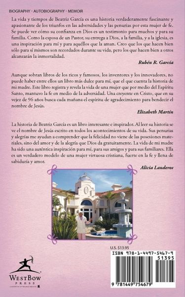 La vida y tiempos de Beatriz García es una historia verdaderamente fascinante y apasionante de los triunfos en las adversidades y las penurias por esta mujer de fe. Se puede ver cómo su confianza en Dios es un testimonio para muchos y para su familia. Como la esposa de un Pastor, su entrega a Dios, a la familia, y a la iglesia, es una inspiración para mí y para aquéllos que la aman. Creo que los que hacen bien sólo para sí mismos son recordados durante su vida, pero los que hacen bien a otros alcanzarán la inmortalidad. Rubén R. García Aunque sobran libros de los ricos y famosos, los inventores y los innovadores, no puede haber entre ellos un libro más dulce para mí, que el que cuenta la historia de mi madre. Este libro registra y revela la vida de una mujer que por medio del Espíritu Santo, mantuvo la fe en medio de la adversidad. Una creyente en Cristo, que en su vejez de 96 años busca cada mañana el espíritu de agradecimiento para bendecir el nombre de Jesús. Elizabeth Martín La historia de Beatriz García es un libro interesante e inspirador. Al leer su historia se ve el nombre de Jesús escrito en todos los acontecimientos de su vida. Sus penurias y alegrías me ayudan a comprender que la felicidad no viene de las posesiones materiales, sino del amor y de la alegría que Dios da gratuitamente. La vida de mi madre ha sido una auténtica inspiración para mí, para sus amigos y para sus familiares. Ella es un verdadero modelo de una mujer virtuosa cristiana, fuerte en la fe y llena de sabiduría y amor. Alicia Landeros