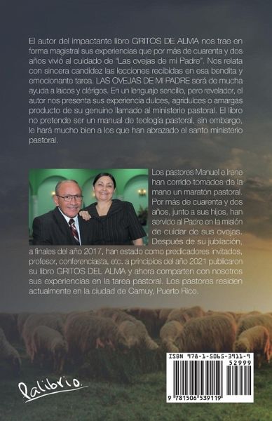 El autor del impactante libro GRITOS DE ALMA nos trae en forma magistral sus experiencias que por más de cuarenta y dos años vivió al cuidado de "Las ovejas de mi Padre". Nos relata con sincera candidez las lecciones recibidas en esa bendita y emocionante tarea. LAS OVEJAS DE MI PADRE será de mucha ayuda a laicos y clérigos. En un lenguaje sencillo, pero revelador, el autor nos presenta sus experiencia dulces, agridulces o amargas producto de su genuino llamado al ministerio pastoral. El libro no pretende ser un manual de teología pastoral, sin embargo, le hará mucho bien a los que han abrazado el santo ministerio pastoral.
