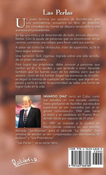LAS PERLAS Un joven termina sus estudios de Bachillerato, por una coincidencia, encuentra un libro de Bitácora. De inmediato su mente se dispara lanzándolo a una aventura sin precedentes. Se fija una meta y se desentiende de todo; amores deportes, fiestas. Con la ayuda de personas que va encontrando en su camino, comienza una odisea, para llevar cabo sus sueños. A pesar de todos los obstáculos, trata de superarlos, su fé le hace seguir adelante. Una narración fácil, ingenua, lograda sobre una vida sencilla, de un joven de pueblo. Para lograr sus propósitos, debe conocer a personas que confían en él y le ayudan y que aprende a amar. Aprende también que los fuertes viven de los débiles, pero que los astutos , viven de los fuertes .Seguir las aventuras de Arnaldo, es seguir la historia de cualquier ser humano, que alguna vez, pensó y soñó en tener la oportunidad de hallar una forma de lograr todo en la vida.