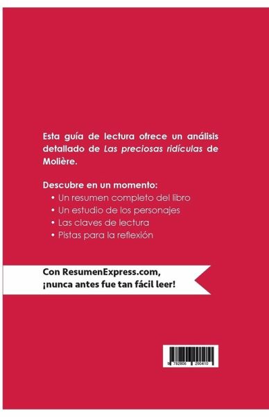 ResumenExpress.com presenta y analiza en esta guía de lectura Las preciosas ridículas, una divertida sátira teatral en un acto del extraordinario autor y comediante francés Molière. En este primer gran éxito del escritor se expone, a través de dos jóvenes para las que guardar las apariencias resulta primordial, el ambiente de pedantería que rodea a las clases adineradas parisinas del siglo XVII. ¡Ya no tienes que leer y resumir todo el libro, nosotros lo hemos hecho por ti! Esta guía incluye: ¿ Un resumen completo del libro ¿ Un estudio de los personajes ¿ Las claves de lectura ¿ Pistas para la reflexión ¿Por qué elegir ResumenExpress.com? Para aprender de forma rápida. Porque nuestras publicaciones están escritas con un estilo claro y conciso que te ayudará a ganar tiempo y a entender las obras sin esfuerzo. Disponibles en formato impreso y digital, te acompañarán en tu aventura literaria. Toma una dosis de literatura acelerada con ResumenExpress.com