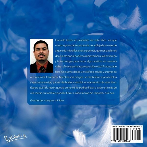 Querido lector el propósito de este libro es que nuestra gente latina se pueda ver reflejada en mas de alguna de mis reflexiones o poemas, que nos podamos dar cuenta que si podemos aprovechar nuestro tiempo y la tecnología para hacer algo positivo en nuestras vidas . ¿Te preguntaras porque digo esto? Porque este libro fue escrito desde un teléfono celular y a través de mi cuenta de Facebook. Mientras mis amigos se dedicaban a poner fotos y sus comentarios, yo me dedicaba a escribir el manuscrito de este libro. Espero querido lector que así como yo he podido llevar a cabo una más de mis metas, tu también puedas llevar a cabo la tuya sin importar cual sea. Gracias por comprar mi libro.