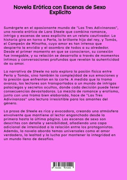 Sumérgete en el apasionante mundo de "Las Tres Adivinanzas", una novela erótica de Lara Steele que combina romance, intriga y escenas de sexo explícito en un relato cautivador. La historia gira en torno a Perla, la brillante hija del rey, y Tomás, el Campeón de Minotha, cuyo amor es tan intenso que despierta la envidia y el asombro de todos a su alrededor. Desde el primer momento en que se conocieron, su conexión fue innegable, y su relación se desarrolla a través de momentos íntimos y conversaciones profundas que revelan la autenticidad de su amor.La narrativa de Steele no solo explora la pasión física entre Perla y Tomás, sino también la complejidad de sus emociones y la presión que enfrentan en la corte. A medida que la trama avanza, los lectores son transportados a un mundo de intrigas palaciegas y secretos ocultos, donde cada decisión puede tener consecuencias devastadoras. La mezcla de romance y erotismo, junto con una trama bien elaborada, hace de "Las Tres Adivinanzas" una lectura irresistible para los amantes del género.La prosa de Steele es rica y evocadora, creando una atmósfera envolvente que mantiene al lector enganchado desde la primera hasta la última página. Las escenas de sexo son descritas con detalle y sensibilidad, añadiendo una capa adicional de intensidad a la relación entre los protagonistas. Además, la novela aborda temas universales como el amor verdadero, la lealtad y la lucha por mantener la integridad en un mundo lleno de desafíos.