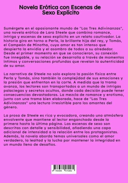 Sumérgete en el apasionante mundo de "Las Tres Adivinanzas", una novela erótica de Lara Steele que combina romance, intriga y escenas de sexo explícito en un relato cautivador. La historia gira en torno a Perla, la brillante hija del rey, y Tomás, el Campeón de Minotha, cuyo amor es tan intenso que despierta la envidia y el asombro de todos a su alrededor. Desde el primer momento en que se conocieron, su conexión fue innegable, y su relación se desarrolla a través de momentos íntimos y conversaciones profundas que revelan la autenticidad de su amor.La narrativa de Steele no solo explora la pasión física entre Perla y Tomás, sino también la complejidad de sus emociones y la presión que enfrentan en la corte. A medida que la trama avanza, los lectores son transportados a un mundo de intrigas palaciegas y secretos ocultos, donde cada decisión puede tener consecuencias devastadoras. La mezcla de romance y erotismo, junto con una trama bien elaborada, hace de "Las Tres Adivinanzas" una lectura irresistible para los amantes del género.La prosa de Steele es rica y evocadora, creando una atmósfera envolvente que mantiene al lector enganchado desde la primera hasta la última página. Las escenas de sexo son descritas con detalle y sensibilidad, añadiendo una capa adicional de intensidad a la relación entre los protagonistas. Además, la novela aborda temas universales como el amor verdadero, la lealtad y la lucha por mantener la integridad en un mundo lleno de desafíos.