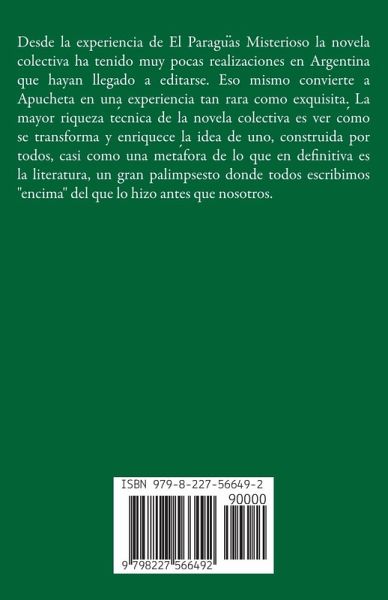 Desde la experiencia de El Paragu¿as Misterioso la novela colectiva ha tenido muy pocas realizaciones en Argentina que hayan llegado a editarse. Eso mismo convierte a Apucheta en una experiencia tan rara como exquisita. La mayor riqueza te¿cnica de la novela colectiva es ver co¿mo se transforma y enriquece la idea de uno, construida por todos, casi como una metäfora de lo que en definitiva es la literatura, un gran palimpsesto donde todos escribimos "encima" del que lo hizo antes que nosotros.