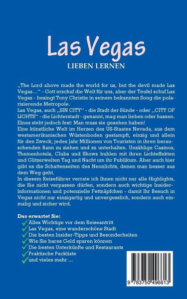 ,,The Lord above made the world for us, but the devil made Las Vegas...'' - Gott erschuf die Welt für uns, aber der Teufel schuf Las Vegas - besingt Tony Christie in seinem bekannten Song die polarisierende Metropole.Las Vegas, auch ,,SIN CITY'' - die Stadt der Sünde - oder ,,CITY OF LIGHTS'' - die Lichterstadt - genannt, mag man lieben oder hassen. Eines steht jedoch fest: Man muss sie gesehen haben!Eine künstliche Welt im Herzen des US-Staates Nevada, aus dem westamerikanischen Wüstenboden gestampft, einzig und allein für den Zweck, jedes Jahr Millionen von Touristen in ihren berau-schenden Bann zu ziehen und zu unterhalten. Unzählige Casinos, Themenhotels, Clubs und Shows buhlen mit ihren Lichteffekten und Glitzerwelten Tag und Nacht um ihr Publikum. Aber auch hier gibt es die Schattenseiten des Neonlichts, denen man besser aus dem Weg geht.In diesem Reiseführer verrate ich Ihnen nicht nur alle Highlights, die Sie nicht verpassen dürfen, sondern auch wichtige Insider-Informationen und potenzielle Fettnäpfchen - damit Ihr Besuch in Vegas nicht nur einzigartig und unvergesslich, sondern auch einmalig und sicher wird.Das erwartet Sie:-Alles Wichtige vor dem Reiseantritt-Las Vegas, eine wunderschöne Stadt-Die besten Insider-Tipps und Besonderheiten-Wie Sie bares Geld sparen können-Die besten Unterkünfte und Restaurants-Praktische Packliste-und vieles mehr ...