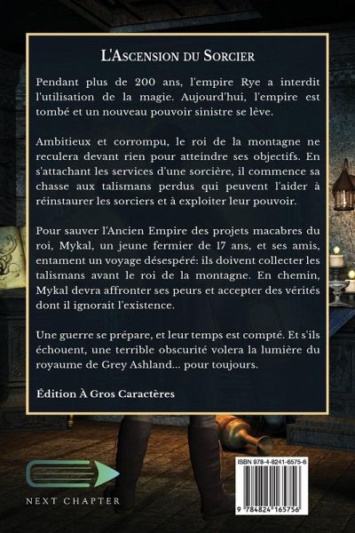 Pendant plus de 200 ans, l'empire Rye a interdit l'utilisation de la magie. Aujourd'hui, l'empire est tombé et un nouveau pouvoir sinistre se lève. Ambitieux et corrompu, le roi de la montagne ne reculera devant rien pour atteindre ses objectifs. En s'attachant les services d'une sorcière, il commence sa chasse aux talismans perdus qui peuvent l'aider à réinstaurer les sorciers et à exploiter leur pouvoir. Pour sauver l'Ancien Empire des projets macabres du roi, Mykal, un jeune fermier de 17 ans, et ses amis, entament un voyage désespéré: ils doivent collecter les talismans avant le roi de la montagne. En chemin, Mykal devra affronter ses peurs et accepter des vérités dont il ignorait l'existence. Une guerre se prépare, et leur temps est compté. Et s'ils échouent, une terrible obscurité volera la lumière du royaume de Grey Ashland... pour toujours. Il s'agit de l'édition en gros caractères de L'Ascension du Sorcier, avec une police de caractères plus grande pour faciliter la lecture.