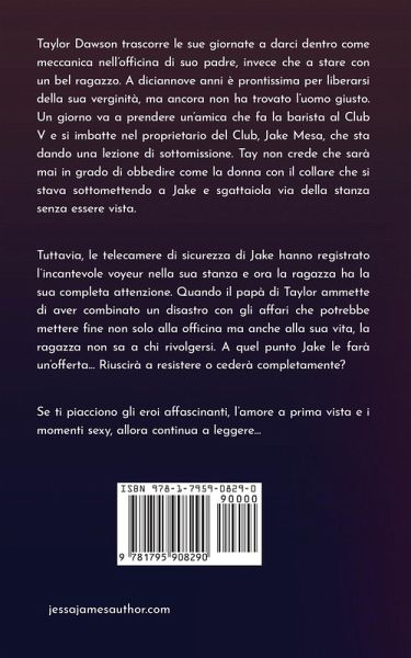 Taylor Dawson trascorre le sue giornate a darci dentro come meccanica nell'officina di suo padre, invece che a stare con un bel ragazzo. A diciannove anni è prontissima per liberarsi della sua verginità, ma ancora non ha trovato l'uomo giusto. Un giorno va a prendere un'amica che fa la barista al Club V e si imbatte nel proprietario del Club, Jake Mesa, che sta dando una lezione di sottomissione. Tay non crede che sarà mai in grado di obbedire come la donna con il collare che si stava sottomettendo a Jake e sgattaiola via della stanza senza essere vista. Tuttavia, le telecamere di sicurezza di Jake hanno registrato l'incantevole voyeur nella sua stanza e ora la ragazza ha la sua completa attenzione. Quando il papà di Taylor ammette di aver combinato un disastro con gli affari che potrebbe mettere fine non solo alla officina ma anche alla sua vita, la ragazza non sa a chi rivolgersi. A quel punto Jake le farà un'offerta... Riuscirà a resistere o cederà completamente? Se ti piacciono gli eroi affascinanti, l'amore a prima vista e i momenti sexy, allora continua a leggere...