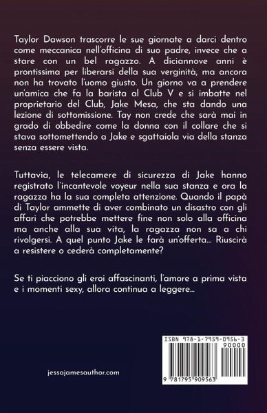 Taylor Dawson trascorre le sue giornate a darci dentro come meccanica nell'officina di suo padre, invece che a stare con un bel ragazzo. A diciannove anni è prontissima per liberarsi della sua verginità, ma ancora non ha trovato l'uomo giusto. Un giorno va a prendere un'amica che fa la barista al Club V e si imbatte nel proprietario del Club, Jake Mesa, che sta dando una lezione di sottomissione. Tay non crede che sarà mai in grado di obbedire come la donna con il collare che si stava sottomettendo a Jake e sgattaiola via della stanza senza essere vista. Tuttavia, le telecamere di sicurezza di Jake hanno registrato l'incantevole voyeur nella sua stanza e ora la ragazza ha la sua completa attenzione. Quando il papà di Taylor ammette di aver combinato un disastro con gli affari che potrebbe mettere fine non solo alla officina ma anche alla sua vita, la ragazza non sa a chi rivolgersi. A quel punto Jake le farà un'offerta... Riuscirà a resistere o cederà completamente? Se ti piacciono gli eroi affascinanti, l'amore a prima vista e i momenti sexy, allora continua a leggere...