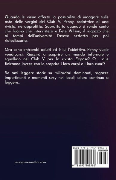 Quando le viene offerta la possibilità di indagare sulle aste delle vergini del Club V, Penny, redattrice di una rivista, ne approfitta. Soprattutto quando si rende conto che l'uomo che intervisterà è Pete Wilson, il ragazzo che ai tempi dell'università l'aveva sedotta per poi ridicolizzarla. Ora sono entrambi adulti ed è lui l'obiettivo. Penny vuole vendicarsi. Riuscirà a scoprire un mondo infernale e squallido nel Club V per la rivista Expose? O i due finiranno invece con lo scoprire i loro corpi e i loro cuori? Se ami leggere storie su miliardari dominanti, ragazze impertinenti e momenti sexy nei locali, allora continua a leggere...