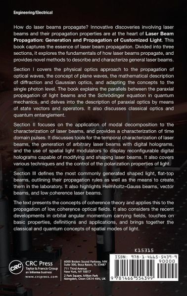 How do laser beams propagate? Innovative discoveries involving laser beams and their propagation properties are at the heart of Laser Beam Propagation: Generation and Propagation of Customized Light. This book captures the essence of laser beam propagation. Divided into three parts, it explores the fundamentals of how laser beams propagate, and provides novel methods to describe and characterize general laser beams. Part one covers the physical optics approach to the propagation of optical waves, the concept of plane waves, the mathematical description of diffraction and Gaussian optics, and adapting the concepts to the single photon level. The book explains the parallels between the paraxial propagation of light beams and the Schrödinger equation in quantum mechanics, and delves into the description of paraxial optics by means of state vectors and operators. It also discusses classical optics and quantum entanglement. Part two focuses on the application of modal decomposition to the characterization of laser beams, and provides a characterization of time domain pulses. It discusses tools for the temporal characterization of laser beams, the generation of arbitrary laser beams with digital holograms, and the use of spatial light modulators to display reconfigurable digital holograms capable of modifying and shaping laser beams. It also covers various techniques and the control of the polarization properties of light. Part three defines the most commonly generated shaped light, flat-top beams, outlining their propagation rules as well as the means to create them in the laboratory. It also highlights Helmholtz-Gauss beams, vector beams, and low coherence laser beams. The text presents the concepts of coherence theory and applies this to the propagation of low coherence optical fields. It also considers the recent developments in orbital angular momentum carrying fields, touches on basics properties, definitions and applications, and brings together the classical and quantum concepts of spatial modes of light.