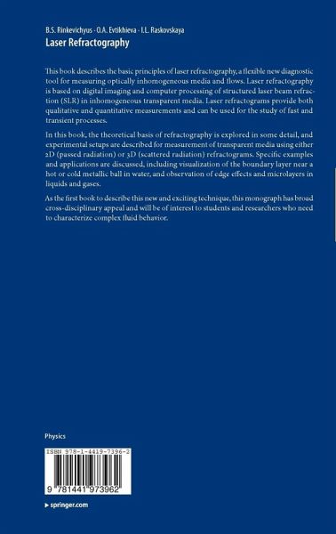 Laser Refractography explores the theoretical basis of refractography, and describes experimental setups for the measurement of transparent media. Specific examples are discussed, including the visualization of the boundary layer near a hot or cold metallic ball in water.This monograph is devoted to the description of the physical fundamentals of laser refractography-a novel informational-measuring technique for the diagnostics of optically inhomogeneous media and flows, based on the idea of using spatially structured probe laser radiation in combination with its digital recording and c- puter techniques for the differential processing of refraction patterns. Considered are the physical fundamentals of this technique, actual optical schemes, methods of processing refraction patterns, and possible applications. This informational technique can be employed in such areas of science and technology as require remote nonperturbative monitoring of optical, thermophysical, chemical, aerohydrodynamic, and manufacturing processes. The monograph can also be recommended for students and postgraduates of - formational, laser, electro-optical, thermophysical, chemical, and other specialties. Laser refractography is a conceptually novel refraction method for the diagn- tics of inhomogeneous media, based on the idea of using spatially structured probe laser radiation in combination with its digital recording and computer techniques for the differential processing of refraction patterns.