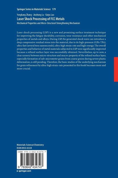 Laser shock processing (LSP) is a new and promising surface treatment technique for improving the fatigue durability, corrosion, wear resistance and other mechanical properties of metals and alloys. During LSP, the generated shock wave can introduce a deep compressive residual stress into the material, due to its high-pressure (GPa-TPa), ultra-fast (several tens nanoseconds), ultra-high strain-rate and high-energy. The overall properties and behavior of metal materials subjected to LSP were significantly improved because a refined surface layer was successfully obtained. Nevertheless, up to now, a clear scenery between micro-structure and macro-property of the refined surface layer, especially formation of sub-micrometer grains from coarse grains during severe plastic deformation, is still pending. Therefore, the basic studies of the underlying mechanism for grain refinement by ultra-high strain-rate presented in this book becomes more and more crucial.