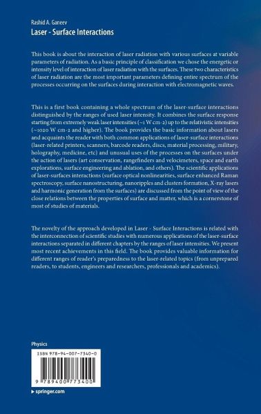 This is a first book containing a whole spectrum of the laser-surface interactions distinguished by the ranges of used laser intensity. It combines the surface response starting from extremely weak laser intensities (~1 W cm-2) up to the relativistic intensities (~1020 W cm-2 and higher). The book provides the basic information about lasers and acquaints the reader with both common applications of laser-surface interactions (laser-related printers, scanners, barcode readers, discs, material processing, military, holography, medicine, etc) and unusual uses of the processes on the surfaces under the action of lasers (art conservation, rangefinders and velocimeters, space and earth explorations, surface engineering and ablation, and others). The scientific applications of laser-surfaces interactions (surface optical nonlinearities, surface enhanced Raman spectroscopy, surface nanostructuring, nanoripples and clusters formation, X-ray lasers and harmonic generation from the surfaces) are discussed from the point of view of the close relations between the properties of surface and matter, which is a cornerstone of most of studies of materials.
