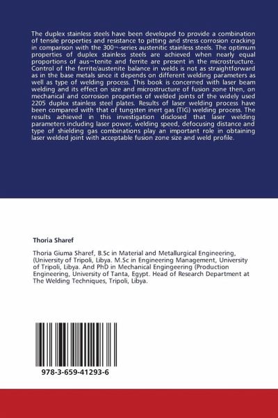 The duplex stainless steels have been developed to provide a combination of tensile properties and resistance to pitting and stress corrosion cracking in comparison with the 300 -series austenitic stainless steels. The optimum properties of duplex stainless steels are achieved when nearly equal proportions of aus tenite and ferrite are present in the microstructure. Control of the ferrite/austenite balance in welds is not as straightforward as in the base metals since it depends on different welding parameters as well as type of welding process. This book is concerned with laser beam welding and its effect on size and microstructure of fusion zone then, on mechanical and corrosion properties of welded joints of the widely used 2205 duplex stainless steel plates. Results of laser welding process have been compared with that of tungsten inert gas (TIG) welding process. The results achieved in this investigation disclosed that laser welding parameters including laser power, welding speed, defocusing distance and type of shielding gas combinations play an important role in obtaining laser welded joint with acceptable fusion zone size and weld profile.