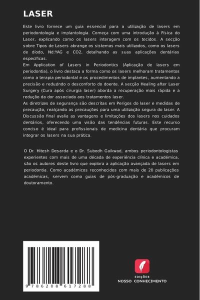 Este livro fornece um guia essencial para a utilização de lasers em periodontologia e implantologia. Começa com uma introdução à Física do Laser, explicando como os lasers interagem com os tecidos. A secção sobre Tipos de Lasers abrange os sistemas mais utilizados, como os lasers de díodo, Nd:YAG e CO2, detalhando as suas aplicações dentárias específicas.Em Application of Lasers in Periodontics (Aplicação de lasers em periodontia), o livro destaca a forma como os lasers melhoram tratamentos como a terapia periodontal e os procedimentos de implantes, aumentando a precisão e reduzindo o desconforto do doente. A secção Healing after Laser Surgery (Cura após cirurgia laser) aborda a recuperação mais rápida e a redução da dor associada aos tratamentos laser.As diretrizes de segurança são descritas em Perigos do laser e medidas de precaução, realçando as precauções para uma utilização segura do laser. A Discussão final avalia as vantagens e limitações dos lasers nos cuidados dentários, oferecendo uma visão das tendências futuras. Este recurso conciso é ideal para profissionais de medicina dentária que procuram integrar os lasers na sua prática.