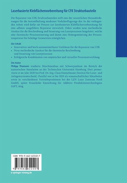 Die Reparatur von CFK Strukturbauteilen stellt eine der wesentlichen Herausforderungen für die Instandhaltung moderner Verkehrsflugzeuge dar. In der vorliegenden Arbeit wird dafür ein Prozess zur laserbasierten Klebflächenvorbereitung für eine adhäsiv ausgeführte Reparatur entwickelt. Dabei werden neue methodische Ansätze für die Beschreibung und Steuerung von Laserprozessen hergeleitet, welche eine thermische Prozesssteuerung und damit eine Homogenisierung der Prozesstemperatur für beliebige Geometrien ermöglichen.