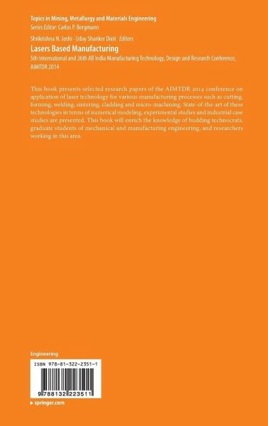 Chapter 1. A Simple Analytical Model of Laser Bending Process.- Chapter 2. Laser Forming of Mild Steel Sheets Using Different Surface Coatings.- Chapter 3. Finite Element Simulations of Laser Bending of Small Sized Sheets.- Chapter 4. Numerical and Experimental Studies on Pulsed Laser Forming of Sheet Metal.- Chapter 5. Experimental Studies on TGM and BM Dominated Curvilinear Laser Bending of Aluminium Alloy Sheets.- Chapter 6. Mathematical Formulation For Development of Compound Curve Surface By Laser Line Heating.- Chapter 7. Surface Alloying of Aluminium with Copper Using CO2 Laser.- Chapter 8. Effect of Pulsed Nd: Yag Laser Parameters in Preplaced TiC Coating on Aluminium Substrate.- Chapter 9. Finite Element Simulation of Laser Cladding for Tool Steel Repair.- Chapter 10. Excimer Laser Micromachining and its Applications.- Chapter 11. Laser Induced Micro-machining and Preliminary Experiments on Manufacturing of Micro-channel on Mild Steel.- Chapter 12. Fabrication of Micro Lens Array by Excimer Laser Micromachining.- Chapter 13. Studies on CO2 Laser Micromachining on PMMA to Fabricate Micro Channel for Microfluidic Applications.- Chapter 14. Energy Based Analysis of Laser Micro-channelling Process on Polymethyl Methacrylate (PMMA).- Chapter 15. Fiber Laser Micro-machining of Ti-6al-4v.- Chapter 16. Nd:Yag Laser Marking on Zirconia Ceramic.- Chapter 17. Nd:Yag Laser Micro drilling of Sic-30BN Nano-composite: Experimental Study and Process Optimization.- Chapter 18. Pulsed Nd:Yag Laser Micro-Turning Process of Alumina Ceramics.- Chapter 19. A Literature Review on CO2 Laser Welding.- Chapter 20. Fiber Laser Welding in a Controlled Inert Gas Atmosphere: An Experimental & Numerical Investigation.- Chapter 21. A 3-D Finite Element Analysis of Transient Temperature Profile ofLaser Welded Ti-6al-4v Alloy.- Chapter 22. Selective Laser Sintering: A Case Study of Tungsten Carbide and Cobalt Powder Sintering by Pulsed Nd:Yag Laser.