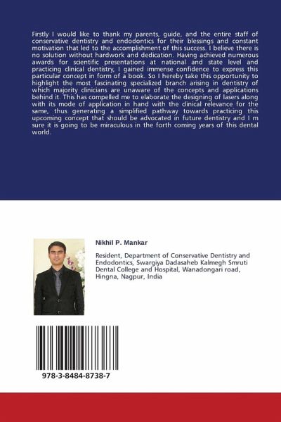 Firstly I would like to thank my parents, guide, and the entire staff of conservative dentistry and endodontics for their blessings and constant motivation that led to the accomplishment of this success. I believe there is no solution without hardwork and dedication. Having achieved numerous awards for scientific presentations at national and state level and practicing clinical dentistry, I gained immense confidence to express this particular concept in form of a book. So I hereby take this opportunity to highlight the most fascinating specialized branch arising in dentistry of which majority clinicians are unaware of the concepts and applications behind it. This has compelled me to elaborate the designing of lasers along with its mode of application in hand with the clinical relevance for the same, thus generating a simplified pathway towards practicing this upcoming concept that should be advocated in future dentistry and I m sure it is going to be miraculous in the forth coming years of this dental world.