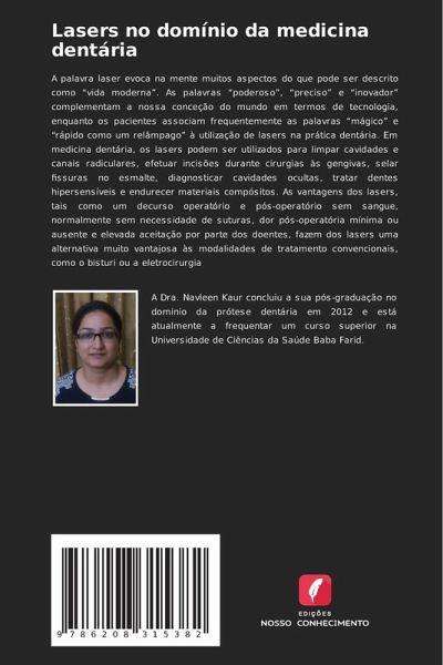 A palavra laser evoca na mente muitos aspectos do que pode ser descrito como ¿vida modernä. As palavras ¿poderoso¿, ¿preciso¿ e ¿inovador¿ complementam a nossa conceção do mundo em termos de tecnologia, enquanto os pacientes associam frequentemente as palavras ¿mágico¿ e ¿rápido como um relâmpago¿ à utilização de lasers na prática dentária. Em medicina dentária, os lasers podem ser utilizados para limpar cavidades e canais radiculares, efetuar incisões durante cirurgias às gengivas, selar fissuras no esmalte, diagnosticar cavidades ocultas, tratar dentes hipersensíveis e endurecer materiais compósitos. As vantagens dos lasers, tais como um decurso operatório e pós-operatório sem sangue, normalmente sem necessidade de suturas, dor pós-operatória mínima ou ausente e elevada aceitação por parte dos doentes, fazem dos lasers uma alternativa muito vantajosa às modalidades de tratamento convencionais, como o bisturi ou a eletrocirurgia