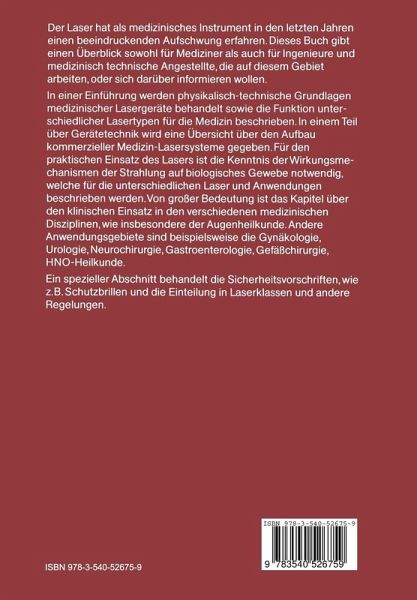 Der Laser hat als medizinisches Instrument in den letzten Jahren einen beeindruckenden Aufschwung erfahren. Dieses Buch gibt einen Überblick sowohl für den Mediziner als auch für den Ingenieur und technischen Angestellten, der auf diesem Gebiet arbeitet, oder sich darüber informieren will. In einer Einführung werden physikalisch-technische Grundlagen medizinischer Lasergeräte behandelt sowie die Funktion unterschiedlicher Lasertypen für die Medizin beschrieben. In einem Teil über Gerätetechnik wird eine Übersicht über den Aufbau kommerzieller Medizin-Lasersysteme gegeben. Für den praktischen Einsatz des Lasers ist die Kenntnis der Wirkungsmechanismen der Strahlung auf biologisches Gewebe notwendig, welche für die unterschiedlichen Laser und Anwendungen beschrieben werden. Von großer Bedeutung ist das Kapitel über den klinischen Einsatz in den verschiedenen medizinischen Disziplinen, wie insbesondere der Augenheilkunde.