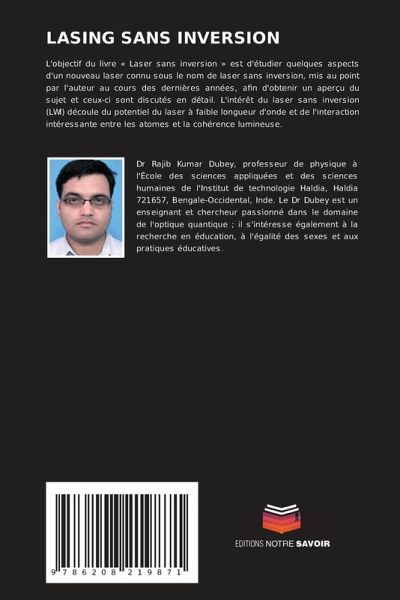 L'objectif du livre « Laser sans inversion » est d'étudier quelques aspects d'un nouveau laser connu sous le nom de laser sans inversion, mis au point par l'auteur au cours des dernières années, afin d'obtenir un aperçu du sujet et ceux-ci sont discutés en détail. L'intérêt du laser sans inversion (LWI) découle du potentiel du laser à faible longueur d'onde et de l'interaction intéressante entre les atomes et la cohérence lumineuse.