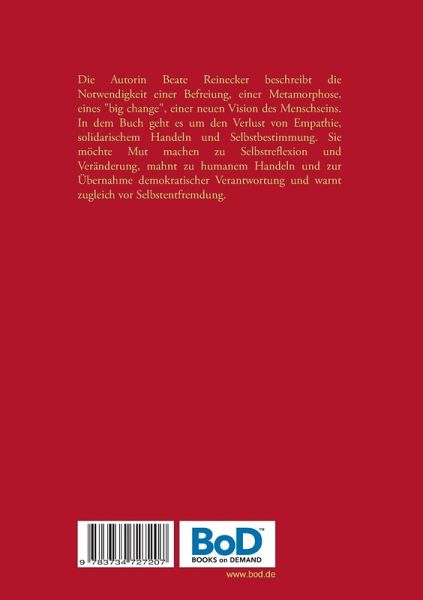 Die Autorin Beate Reinecker beschreibt die Notwendigkeit einer Befreiung, einer Metamorphose, eines "big change", einer neuen Vision des Menschseins. In dem Buch geht es um den Verlust von Empathie, solidarischem Handeln und Selbstbestimmung. Sie möchte Mut machen zu Selbstreflexion und Veränderung, mahnt zu humanem Handeln und zur Übernahme demokratischer Verantwortung und warnt zugleich vor Selbstentfremdung.