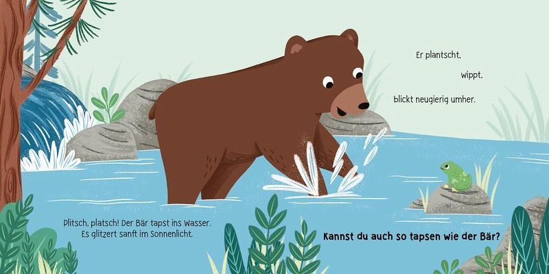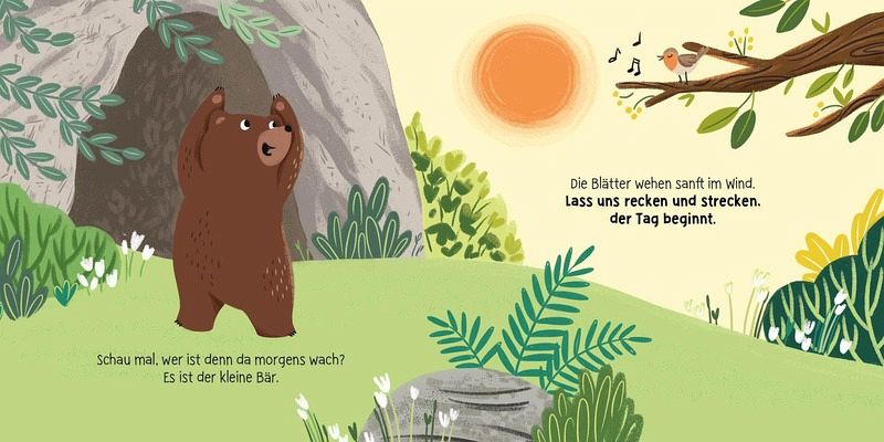 Der kleine Bär erlebt einen ereignisreichen Tag im Wald! Begleite ihn beim Spielen, Tapsen und Brummen. Mach mit, wenn der Bär sich morgens nach dem Aufstehen streckt und flüstere leise, wenn er abends wieder schlafen geht. So kannst du Teil der Geschichte sein!