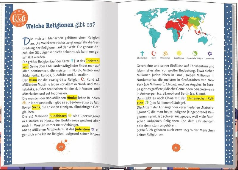 In diesem Buch erfahren Kinder ab 8 Jahren viel Spannendes über die Weltreligionen, aber auch über Glaubensgemeinschaften, die vielleicht nicht so bekannt sind. Ein abwechslungsreich gestaltetes Wissensbuch für Kinder, das einen wertvollen Beitrag zur Auseinandersetzung mit der Vielfalt des Glaubens leistet!