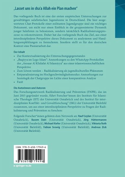 Zur Kontextualisierung des Untersuchungsgegenstandes.- "Baqiyya im Lego-Islam": Anmerkungen zu den WhatsApp-Protokollen der "Ansaar Al Khilafat Al Islamiyya" aus einer islamwissenschaftlichen Perspektive.- Zum Löwen werden - Radikalisierung als jugendkulturelles Phänomen.- Entparadoxierung im Hochgeschwindigkeitsmodus: Anmerkungen zur Soziologik der Chatgruppe im Lichte einer komparativen Analyse.- Fazit.