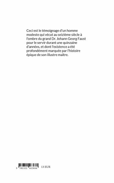 Ceci est le témoignage d'un homme modeste qui vécut au seizième siècle à l'ombre du grand Dr. Johann Georg Faust pour le servir durant une quinzaine d'années, et dont l'existence a été profondément marquée par l'histoire épique de son illustre maître.