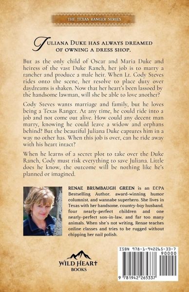 Juliana Duke's dreams don't include ranching. But as the only child of Oscar and Maria Duke and heiress of the vast Duke Ranch, her job is to marry a rancher and produce a male heir. When Lt. Cody Steves rides onto the scene, her resolve to place duty over daydreams is shaken. Now that her heart's been lassoed by the handsome lawman, will she be able to love another? Cody Steves wants marriage and family, but he loves being a Texas Ranger. At any time, he could ride into a job and not come out alive. How could any decent man marry, knowing he could leave a widow and orphans behind? But the beautiful Juliana Duke captures him in a way no other has. When he learns of a secret plot to take over the Duke Ranch, Cody must risk everything to save Juliana. Little does he know, the outcome will be nothing like he's planned.