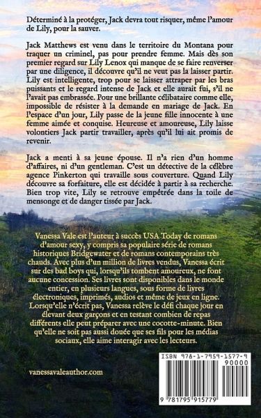 Déterminé à la protéger, Jack devra tout risquer, même l'amour de Lily, pour la sauver. Jack Matthews est venu dans le territoire du Montana pour traquer un criminel, pas pour prendre femme. Mais dès son premier regard sur Lily Lenox qui manque de se faire renverser par une diligence, il découvre qu'il ne veut pas la laisser partir. Lily est intelligente, trop pour se laisser attraper par les bras puissants et le regard intense de Jack et elle aurait fui, s'il ne l'avait pas embrassée. Pour une brillante célibataire comme elle, impossible de résister à la demande en mariage de Jack. En l'espace d'un jour, Lily passe de la jeune fille innocente à une femme aimée et conquise. Heureuse et amoureuse, Lily laisse volontiers Jack partir travailler, après qu'il lui ait promis de revenir. Jack a menti à sa jeune épouse. Il n'a rien d'un homme d'affaires, ni d'un gentleman. C'est un détective de la célèbre agence Pinkerton qui travaille sous couverture. Quand Lily découvre sa forfaiture, elle est décidée à partir à sa recherche. Bien trop vite, Lily se retrouve empêtrée dans la toile de mensonge et de danger tissée par Jack.