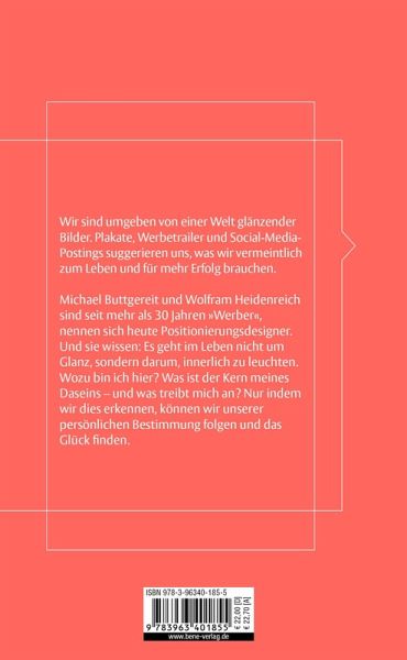 Michael Buttgereit und Wolfram Heidenreich kennen die Welt der Werbung und die Tricks der Marketingprofis nur zu gut. Sie sind selbst seit mehr als 30 Jahren »Werber«, nennen sich heute Positionierungsdesigner. Aber sie wissen auch: Es geht im Leben nicht um Glanz, sondern darum, innerlich zu leuchten. Die beiden haben bei der Beratung zahlreicher Unternehmen aber auch ganz persönlich erfahren, dass es letztlich immer um Sinn geht. Zu wissen, wofür man steht.