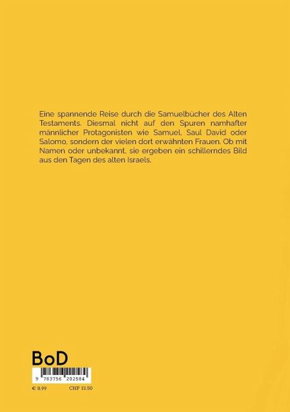 Eine spannende Reise durch die Samuelbücher des Alten Testaments. Diesmal nicht auf den Spuren namhafter männlicher Protagonisten wie Samuel, Saul David oder Salomo, sondern der vielen dort erwähnten Frauen. Ob mit Namen oder unbekannt, sie ergeben ein schillerndes Bild aus den Tagen des alten Israels.