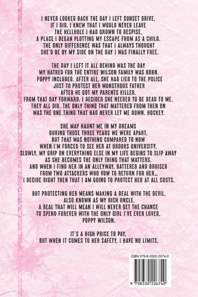 I never looked back the day I left Sunset Drive. If I did, I knew that I would never leave the hellhole I had grown to despise, a place I began plotting my escape from as a child. The only difference was that I always thought she'd be by my side on the day I was finally free. The day I left it all behind was the day my hatred for the entire Wilson family was born. Poppy included. After all, she had lied to the police just to protect her monstrous father after he got my parents killed. From that day forward, I decided she needed to be dead to me. They all did. The only thing that mattered from then on was the one thing that had never let me down. Hockey. She may haunt me in my dreams during those three years we were apart, but that was nothing compared to now when I'm forced to see her at Brooks University. Slowly, my grip on everything else in my life begins to slip away as she becomes the only thing that matters. And when I find her in an alleyway, battered and bruised from two attackers who vow to return for her...I decide right then that I am going to protect her at all costs. But protecting her means making a deal with the devil, also known as my rich uncle. A deal that will mean I will never get the chance to spend forever with the only girl I've ever loved. Poppy Wilson. It's a high price to pay, but when it comes to her safety, I have no limits. This is the final book in the Puck Boys of Brooks University series. The MCs are Walker & Poppy.