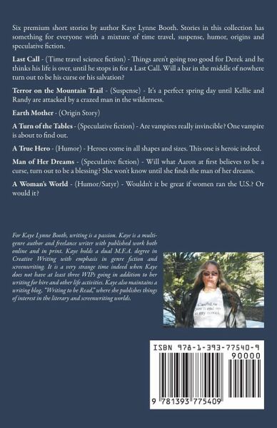 Six premium short stories by author Kaye Lynne Booth. Stories in this collection has something for everyone with a mixture of time travel, suspense, humor, origins and speculative fiction. Last Call - (Time travel science fiction) - Things aren't going too good for Derek and he thinks his life is over, until he stops in for a Last Call. Will a bar in the middle of nowhere turn out to be his curse or his salvation? Terror on the Mountain Trail - (Suspense) - It's a perfect spring day until Kellie and Randy are attacked by a crazed man in the wilderness. Earth Mother - (Origin Story) A Turn of the Tables - (Speculative fiction) - Are vampires really invincible? One vampire is about to find out. A True Hero - (Humor) - Heroes come in all shapes and sizes. This one is heroic indeed. Man of Her Dreams - (Speculative fiction) - Will what Aaron at first believes to be a curse, turn out to be a blessing? She won't know until she finds the man of her dreams. A Woman's World - (Humor) - Wouldn't it be great if a woman could rule the U.S.? Or would it? - Satyrical comment on current affairs of days past.
