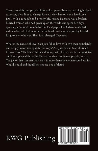 Three very different people didn't wake up one Tuesday morning in April expecting their lives to change forever. Matt Benson was a handsome EMT with a good job and a lonely life. Justine Duchane was a broken hearted woman who had given up on the world and spent her days spouting a political column for the local paper. Hal Urban was failed writer who had hidden so far in the bottle and sports reporting he had forgotten who he was. Then it all changed. They met. What is the nature of love? Can you fall in love with two men completely and deeply in too totally different ways? Are Justine and Matt destined for true love? The friendship she develops with Hal makes her a politician and him a playwright again. The two of them are better people, in fact. The joy of that summer with Matt is more than any woman could ask for. Would, could and should she choose one of them?