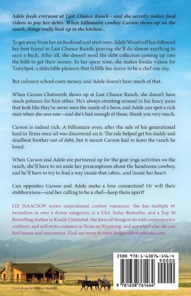 Adele feeds everyone at Last Chance Ranch - and she secretly makes food videos to pay her debts. When billionaire cowboy Carson shows up on the ranch, things really heat up in the kitchen... To get away from her ex-husband and start over, Adele Woodruff has followed her best friend to Last Chance Ranch, proving she'll do almost anything to earn a buck. After all, she doesn't need the debt collectors coming up into the hills to get their money. In her spare time, she makes foodie videos for TastySpot, a delectable pleasure that fulfills her desire to be a chef one day. But culinary school costs money, and Adele doesn't have much of that. When Carson Chatworth shows up at Last Chance Ranch, she doesn't have much patience for him either. He's always strutting around in his fancy jeans that look like they've never seen the inside of a barn, and Adele can spot a rich man when she sees one-and she's had enough of those, thank you very much. Carson is indeed rich. A billionaire even, after the sale of his generational land in Texas once oil was discovered on it. The sale helped get his daddy and deadbeat brother out of debt, but it meant Carson had to leave the ranch he loved. When Carson and Adele are partnered up for the goat yoga activities on the ranch, she'll have to set aside her presumptions about the handsome cowboy, and he'll have to try to find a way inside that cabin...and inside her heart. Can opposites Carson and Adele make a love connection? Or will their stubbornness-and her calling to be a chef-keep them apart?