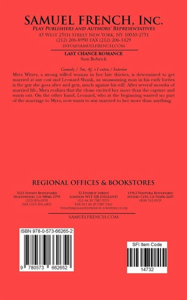 Comedy / 3m, 4f, +1 extra / Interior Set Myra Witzer, a strong willed woman in her late thirties, is determined to get married at any cost and Leonard Shank, an unassuming man in his early forties is the guy she goes after and gets, much against his will. After several months of married life, Myra realizes that the chase excited her more than the capture and wants out. On the other hand, Leonard, who at the beginning wanted no part of the marriage to Myra, now wants to stay married to her more t
