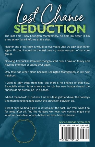 The last time I saw Lexington Montgomery, he held my sister in his arms as my fiancé left me at the altar. Neither one of us knew it would be two years until we saw each other again. Or that it would be the last time my sister was part of our core group. Grieving, I'm back in Colorado trying to start over. I have no family and have no intention of dating ever again. Only fate has other plans because Lexington Montgomery is my new neighbor. I want to stay away from him, but there's no chance of that now. Especially when his ex shows up to rub her new husband-and the chance at his dream job-in his face. I didn't mean to do it, but now I'm Lex's fake girlfriend over the holidays and there's nothing fake about the attraction between us. Except once we finally give in, it turns out the past I ran from wasn't so far away after all. And the dangers we never saw coming might end what we have-fake or not-before we even have a chance. **Last Chance Seduction is a fake relationship, forced proximity, holiday romance in the Montgomery Ink Legacy series featuring Lexington and Mercy. Each book can be read as a complete standalone. An HEA is guaranteed!** Lexington Montgomery is Beckett and Eliza's son from Inked Obsession.