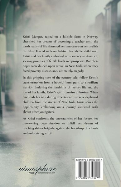 Kristi Monger, raised on a hillside farm in Norway, cherished her dreams of becoming a teacher until the harsh reality of life shattered her innocence on her twelfth birthday. Forced to leave behind her idyllic childhood, Kristi and her family embarked on a journey to America, seeking promises of fertile lands and prosperity. But their hopes were dashed upon arrival in New York, where they faced poverty, disease, and, ultimately, tragedy. In this gripping turn-of-the-century tale, follow Kristi's transformation from a hopeful immigrant to a resilient warrior. Enduring the hardships of factory life and the loss of her family, Kristi's spirit remains unbroken. When fate leads her to a daring experiment to rescue orphaned children from the streets of New York, Kristi seizes the opportunity, embarking on a journey westward with eleven other youngsters. As Kristi confronts the uncertainties of her future, her unwavering determination to fulfill her dream of teaching shines brightly against the backdrop of a harsh and unforgiving world.