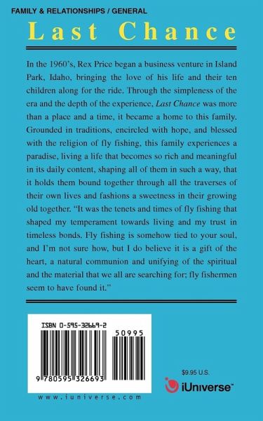 In the 1960's, Rex Price began a business venture in Island Park, Idaho, bringing the love of his life and their ten children along for the ride. Through the simpleness of the era and the depth of the experience, Last Chance was more than a place and a time, it became a home to this family. Grounded in traditions, encircled with hope, and blessed with the religion of fly fishing, this family experiences a paradise, living a life that becomes so rich and meaningful in its daily content, shaping all of them in such a way, that it holds them bound together through all the traverses of their own lives and fashions a sweetness in their growing old together.